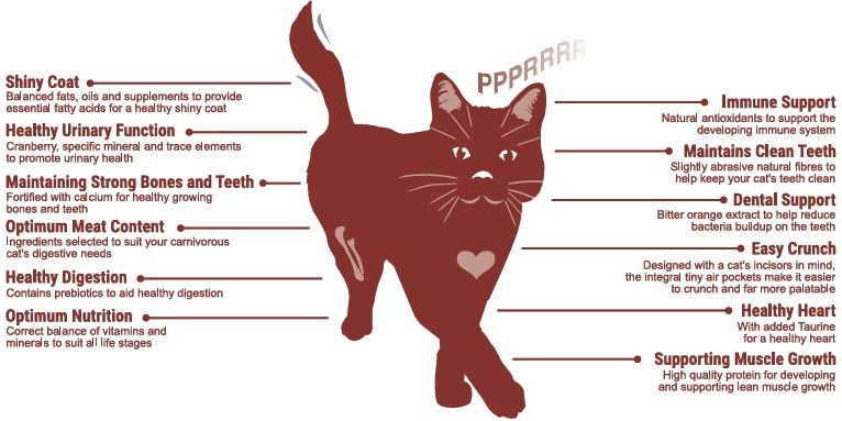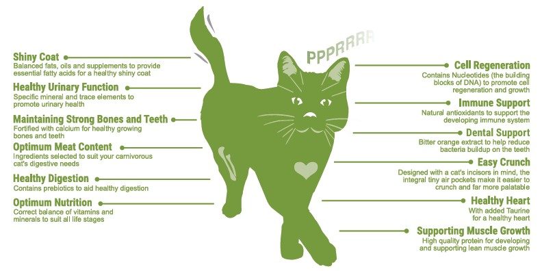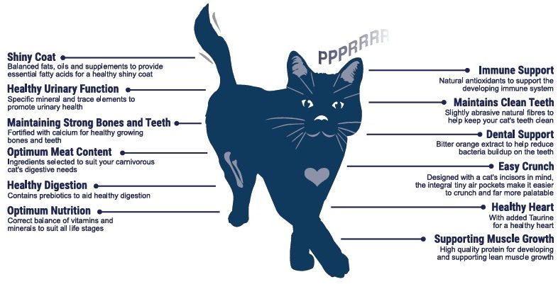 Composition: Poultry Meal (28% (inc.Chicken 25%)), Rice, Wholegrain Maize, Poultry Fat, Wholegrain Wheat, Maize Gluten Meal, Dried Beet Pulp, Hydrolysed Poultry Protein, Poultry Gravy, Brewer’s Yeast, Minerals, Fish Meal, Egg Powder, Short Chain Fructo-Oligosaccharides (0.4%), High Nucleotide, Yeast Extract. Analytical Constituents: Crude Protein 32%, Crude Fat 17%, Crude Fibre 1.5%, Crude Ash 8%, Calcium 1.5%. Nutritional Additives: Vitamins: Vitamin A 30000 IU/kg, Vitamin D3 1500 IU/kg, Vitamin E 150 mg/kg, Taurine 1000 mg/kg. Trace Elements: Zinc (as Zinc sulphate monohydrate) 100 mg/kg, Iron (as Iron (II) sulphate monohydrate) 50 mg/kg, Manganese (as Manganese (II) oxide) 15 mg/kg, Copper (as Copper (II) sulphate pentahydrate) 5 mg/kg, Iodine (as Calcium iodate anhydrous) 0.5 mg/kg, Selenium (as Sodium selenite) 0.1 mg/kg.