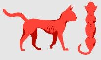 Ribs, spine, hip bones, and all bony prominences are clearly visible (short hair) and easy to feel. Severe tummy tuck with clear loss of muscle mass and body fat.